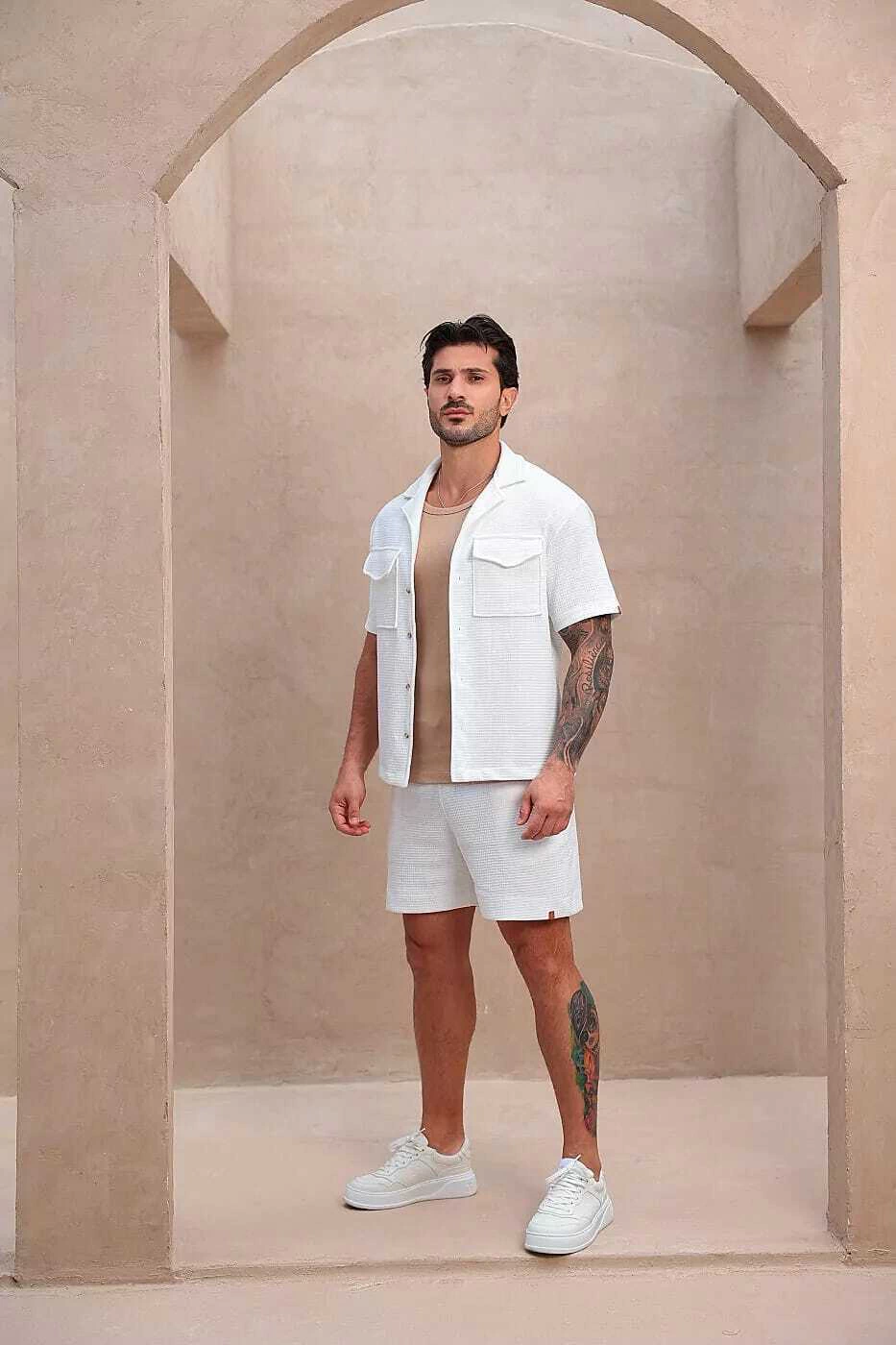 Elegância e conforto em um único look. Este conjunto traz camisa de manga curta com bolsos frontais e fechamento por botões, combinada ao short com modelagem reta e caimento leve. O tecido texturizado adiciona sofisticação à peça, enquanto o tom off white reforça a versatilidade e o estilo clean. Ideal para compor produções casuais com toque premium — perfeito para dias quentes, encontros ou momentos de lazer com estilo.