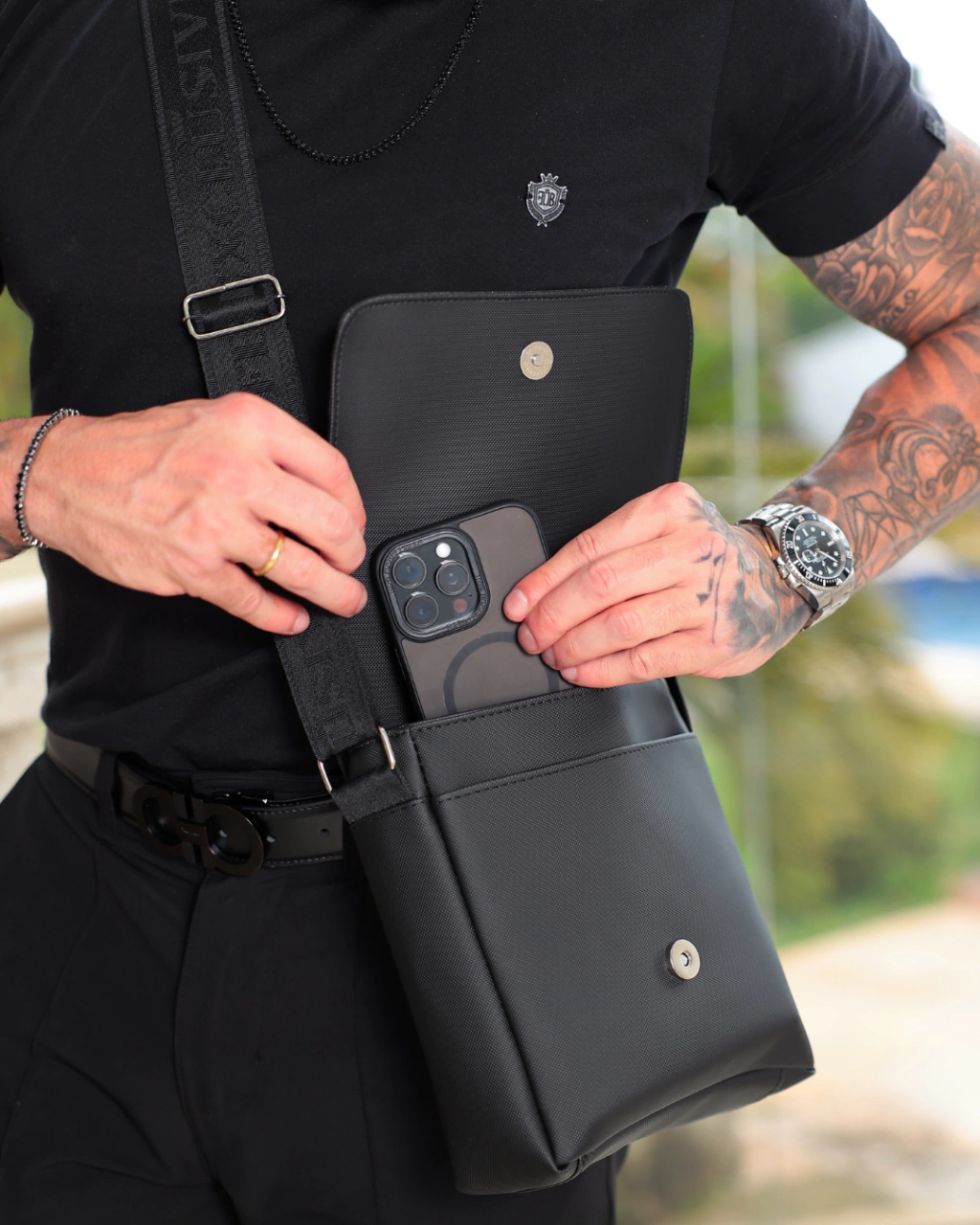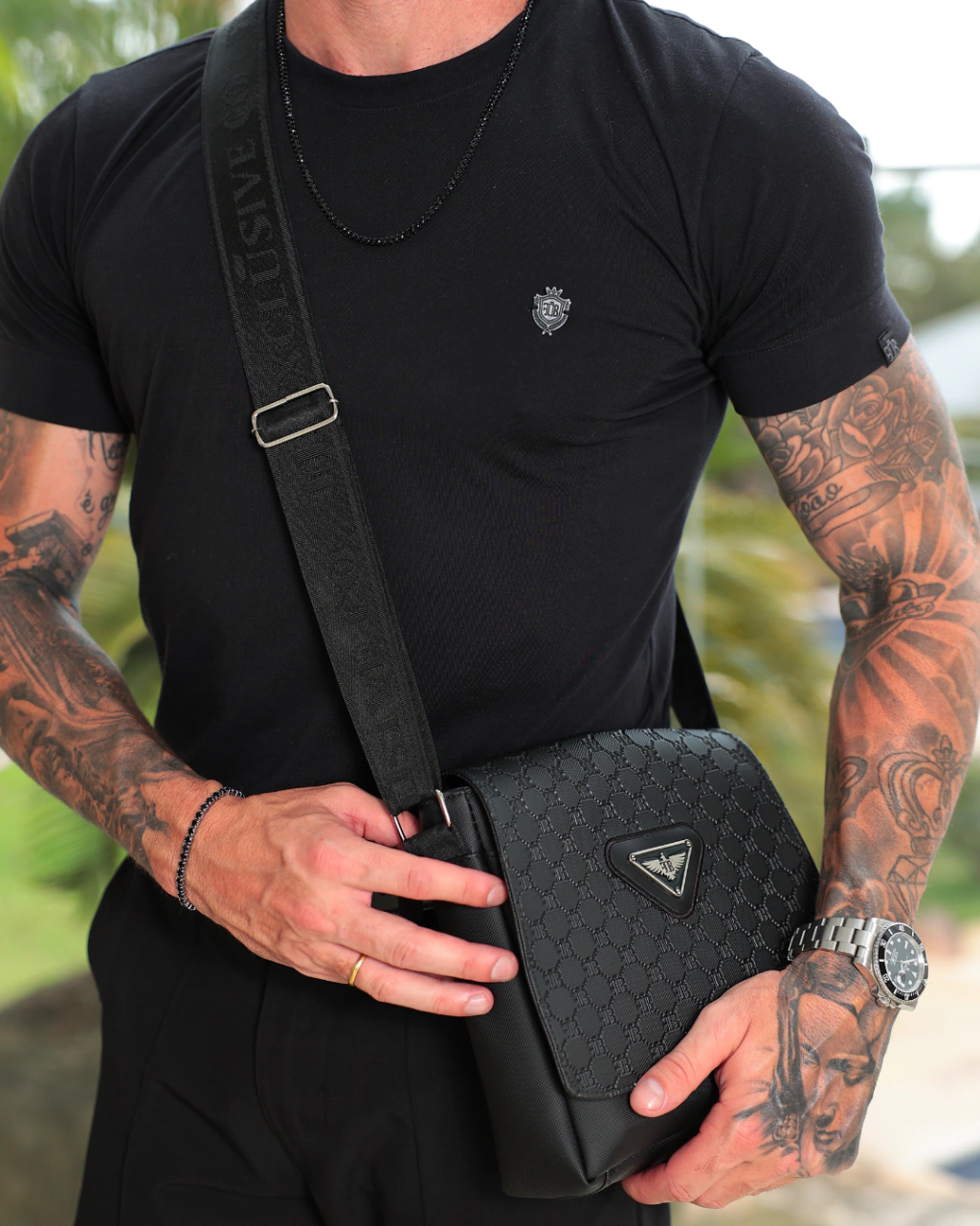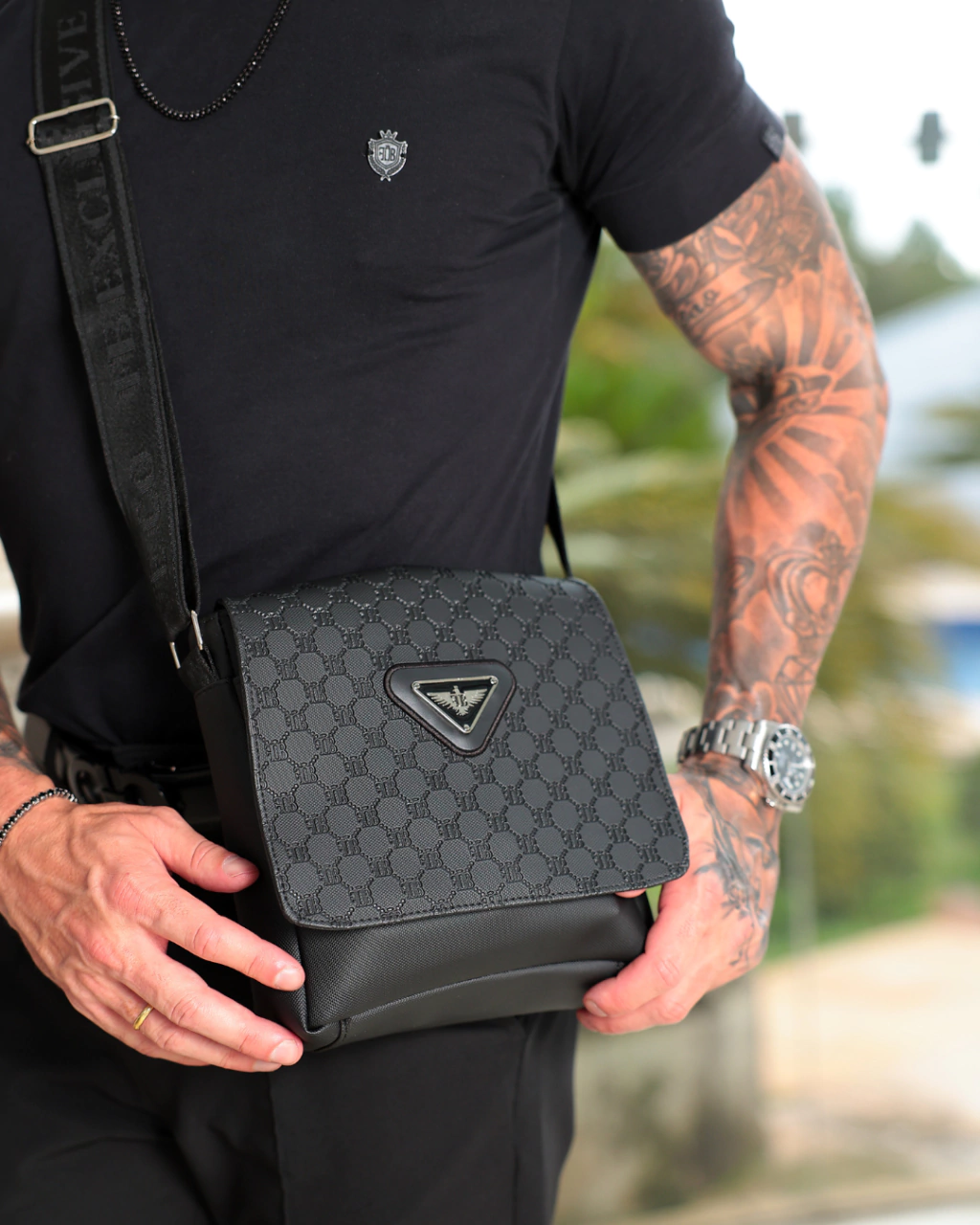 O modelo conta com alça personalizada FB Exclusive Clothing, ajustável para garantir conforto e praticidade no uso diário. A tampa frontal destacada traz o brasão metálico FB, reforçando a estética premium que caracteriza cada detalhe da peça.